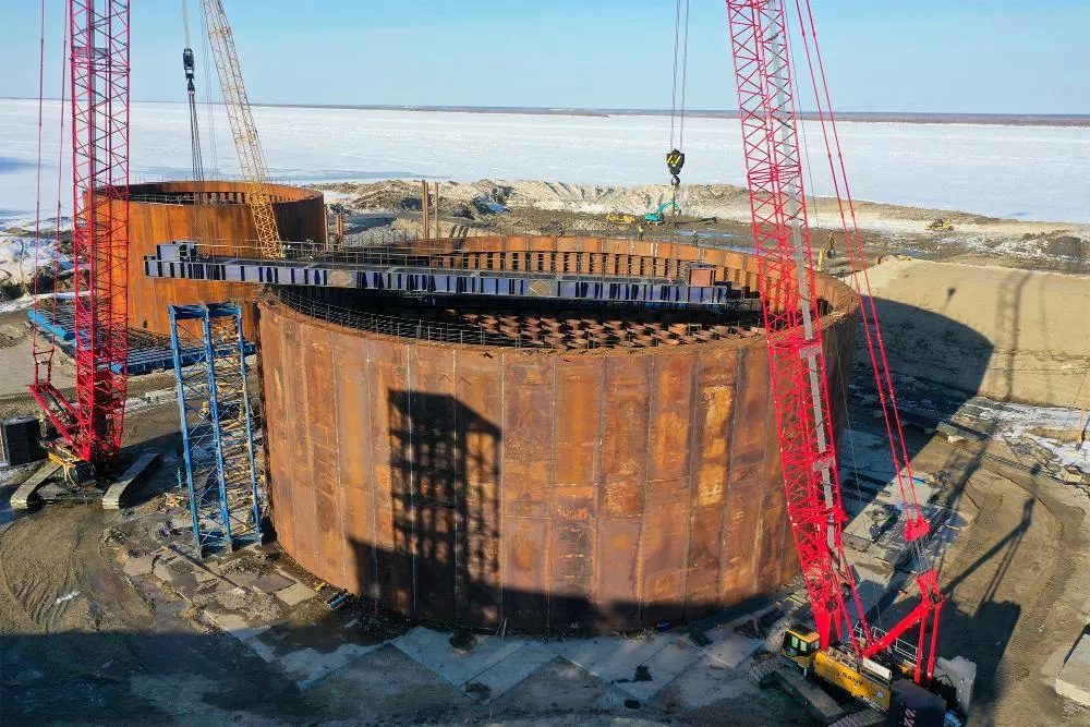 Рядом на площадке полностью собран и готов к сплаву боковой коффердам опоры №10. С приходом половодья планируется начать его перемещение к месту установки у правого берега. При координации Министерства транспорта и дорожного хозяйства Якутии, совместно с компаниями речного флота начата проработка этой сложной операции.