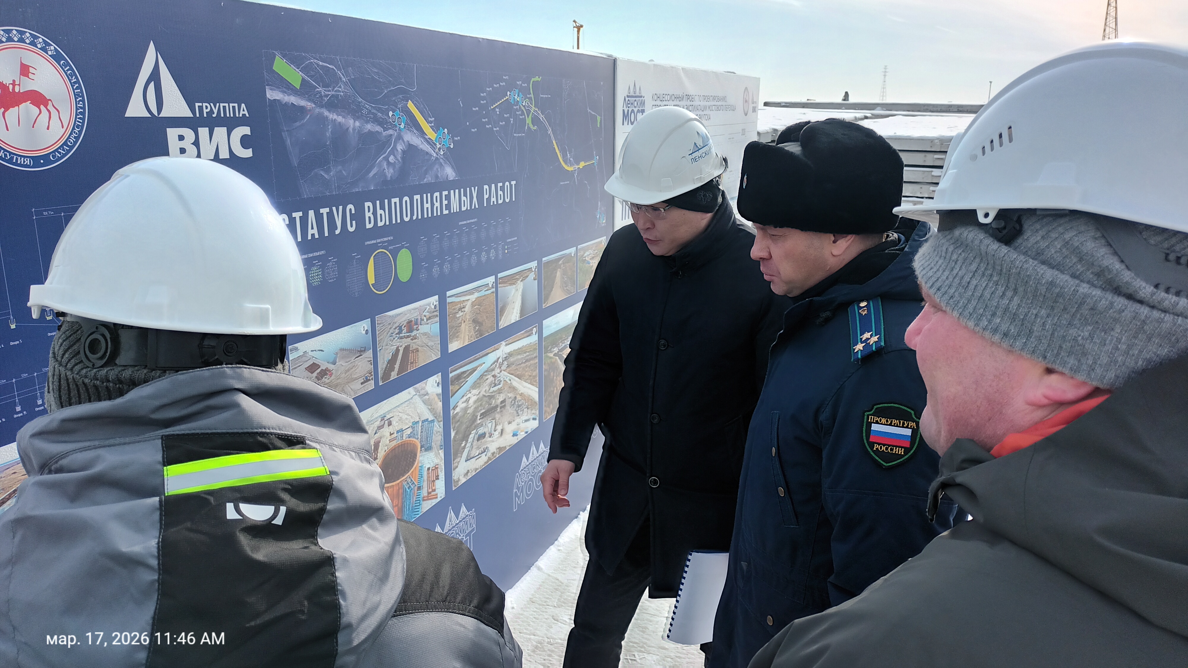 Сегодня, 17 марта, состоялся выездной осмотр строительной площадки мостового перехода через реку Лену. Напомним, объект реализуется по национальному проекту «Инфраструктура для жизни», инициированному Президентом страны Владимиром Путиным. В мероприятии приняли участие заместитель Прокурора Республики Саха (Якутия) Алексей Башмаков и министр транспорта и дорожного хозяйства региона Владимир Сивцев.