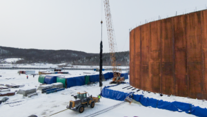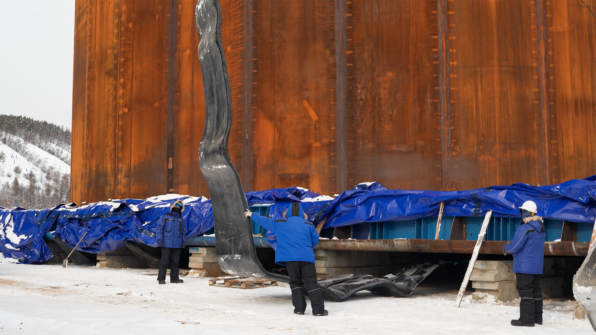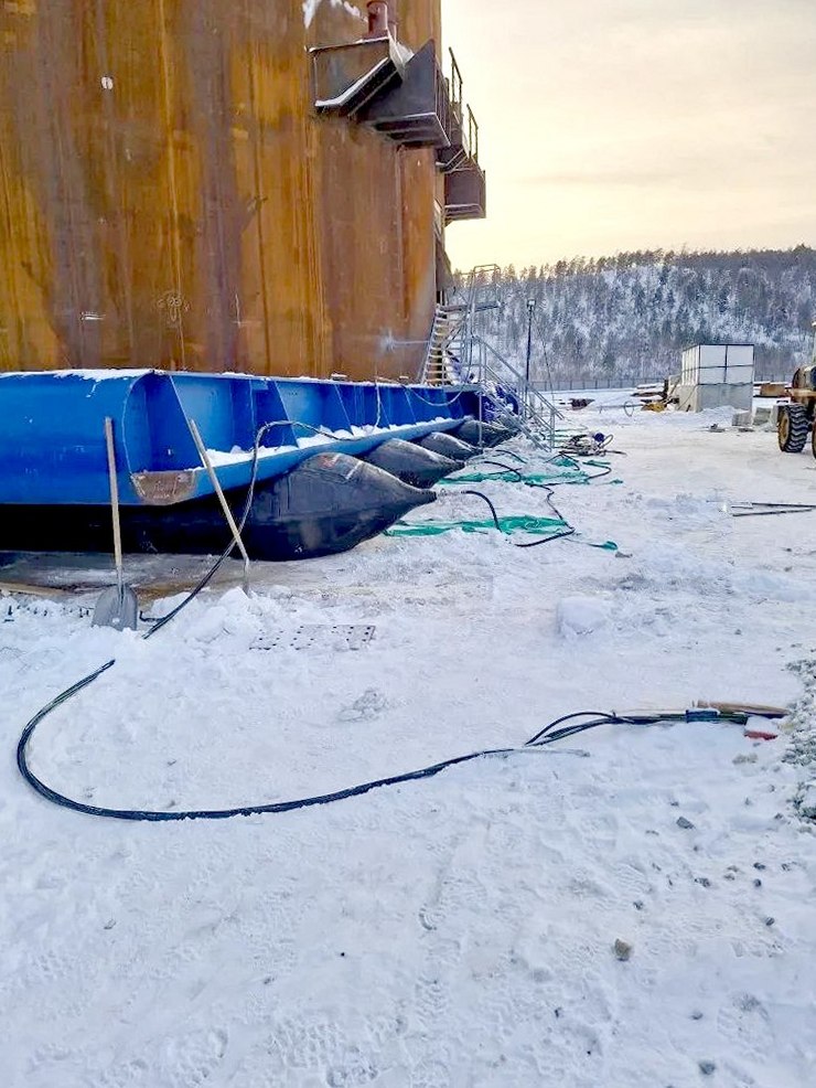 Перед началом перемещения первого коффердама под ним были смонтированы 16 пневматических ролик-мешков. Это большие надувные цилиндры длиной 16 м и диаметром 2 м, которые позволяют плавно «перекатывать» многотонный объект. Движение коффердама обеспечивают мощные лебёдки, работающие как тяговый механизм. В передней части работают две лебёдки с суммарным тяговым усилием в 280 тонн. С противоположной стороны задействован тормозной комплекс – также из двух лебёдок, создающих усилие до 420 тонн. Такая система сдерживания позволяет безопасно перемещать коффердам, полностью контролируя скорость и траекторию его движения.